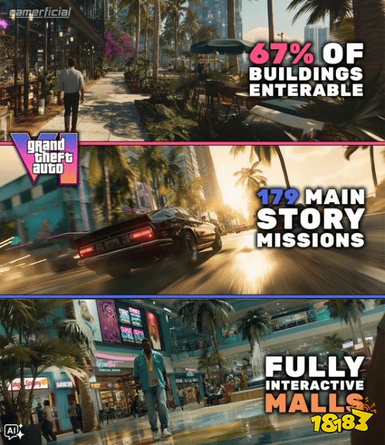 在整个游戏世界中,约有67%的建筑物可以进入。大量的完全互动式购物中心:遍布佛罗里达州莱昂尼达并延伸至佐治亚州的179个主要任务