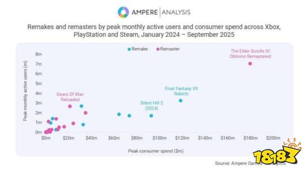 该项研究取样覆盖2024年1月至2025年9月期间发行的42款作品(含15款重制版、27款复刻版),数据显示消费者对单款重制版游戏的投入平均达到复刻版的2.2倍。值得注意的是,《上古卷轴4:湮没》复刻版成为复刻阵营中的突出案例,其在PlayStation、Xbox和Steam平台的玩家消费峰值约1.8亿美元,月活跃用户数最高达700万。