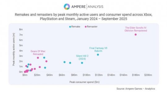 该项研究取样覆盖2024年1月至2025年9月期间发行的42款作品(含15款重制版、27款复刻版),数据显示消费者对单款重制版游戏的投入平均达到复刻版的2.2倍。值得注意的是,《上古卷轴4:湮没》复刻版成为复刻阵营中的突出案例,其在PlayStation、Xbox和Steam平台的玩家消费峰值约1.8亿美元,月活跃用户数最高达700万。