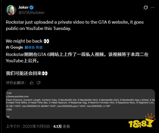 2025年11月,R星在《GTA6》延期至2026年11月19日发售后,突然上传“私人视频”引发猜测,玩家纷纷推测视频或为第三支预告片,也有可能是《GTA Online》更新内容,进一步激发了玩家对《GTA6》的高度期待。