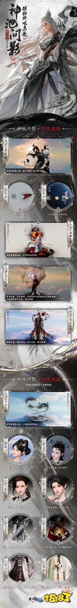 新赛年神池问影还有更多缤纷内容来袭,包含熊猫坐骑【逐风·叠猫猫】、脚印【步步星渊】、随身特效【灵韵·晦瞳临霄】、神环【法相·混元漩生】、披帛【缡风·烛龙噬目】以及超多精巧饰品,打造专属江湖造型,喜欢的少侠不要错过啦~