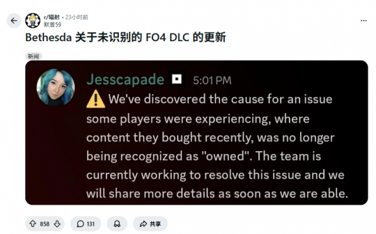 据B社社区经理Jessica Clark在Discord上发布的信息,团队已确认了导致玩家已购DLC被误判为“未拥有”的问题原因。Clark表示:“我们已发现部分玩家近期购买的内容未被识别为‘已拥有’的原因。团队目前正在修复该问题,并将在第一时间公布更多进展。”
