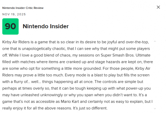 《星之卡比:空中骑士》是一款充满了“想要带给玩家纯粹快乐、夸张体验”的游戏,它毫不掩饰地混乱、热闹,所以我也理解为什么有些玩家可能会被它劝退。虽然我个人非常喜欢这种混乱与欢乐的混合——就像在《任天堂明星大乱斗特别版》中把道具开到最大、场景陷阱全开那样的对局——但也有人更偏好更“落地”、更可控的体验。对这些玩家来说,《星之卡比:空中骑士》可能就显得有点“太过头”。