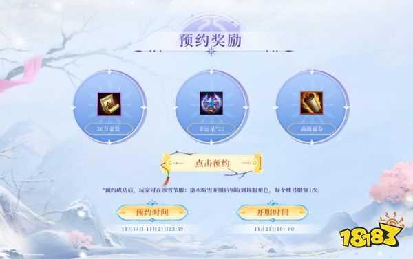 预约成功后,玩家可在冰雪节服:洛水听雪开服后领取到该服角色,