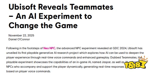 根据育碧官方介绍,Teammates旨在“探索新技术如何改变和提升玩家游戏体验”。早在2024年3月,育碧就曾启动过名为“NEO NPC”的研究项目,尝试打造可以实时语音互动的游戏角色,而此次的“Teammates”可以视作该计划的升级版本。
