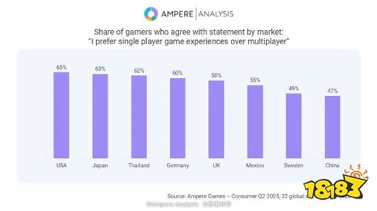 数据显示,美国是单人游戏爱好者比例最高的国家,高达65%的玩家更偏好单人体验。日本(63%)、泰国(62%)和德国(60%)紧随其后。相比之下,英国为58%。