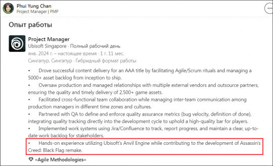 网络用户近日关注到育碧新加坡员工的领英资料。作为项目经理,她在页面中直接注明,自己的工作内容包括在《刺客信条4:黑旗》重制版开发过程中使用Anvil引擎。