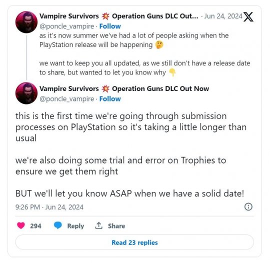开发商 Poncle 今年早些时候宣布,其备受喜爱的自上而下视角 Roguelite?弹幕射击游戏《吸血鬼幸存者》将于今年夏天的某个时候登陆 PlayStation 平台,而现在夏天已至,那些希望在索尼主机上体验这款游戏的玩家想要知道到底何时才能玩到。
